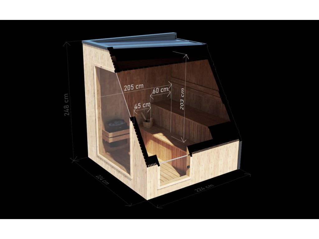 Vnitřní rozměr cca 205 × 205 cm poskytuje dostatek místa pro pohodlné saunování 4 až 6 osob. Dvouúrovňové lavice umožňují měnit intenzitu tepla podle preference – od jemného pro relax až po intenzivní saunový rituál.