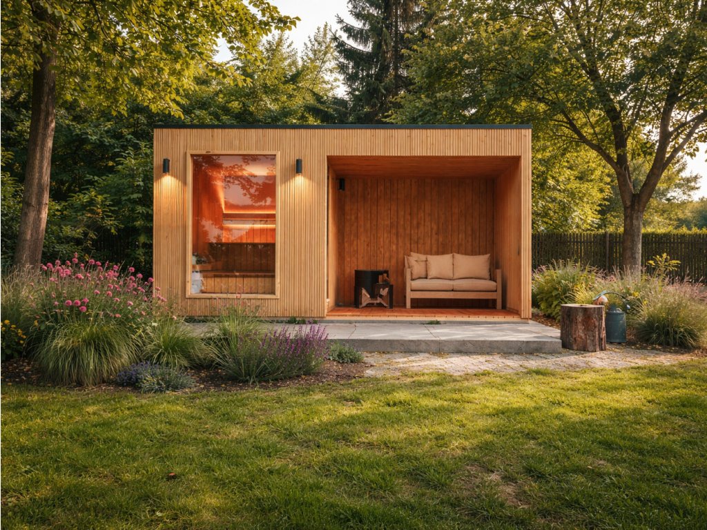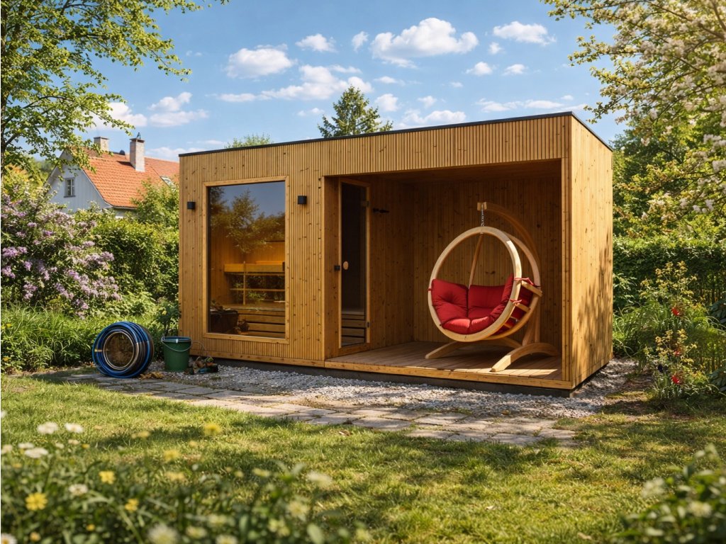 Sauna spojuje plnohodnotnou saunu s prostornou krytou terasou. Nejde jen o větší model, ale o řešení, které vytváří samostatnou relaxační zónu na zahradě.