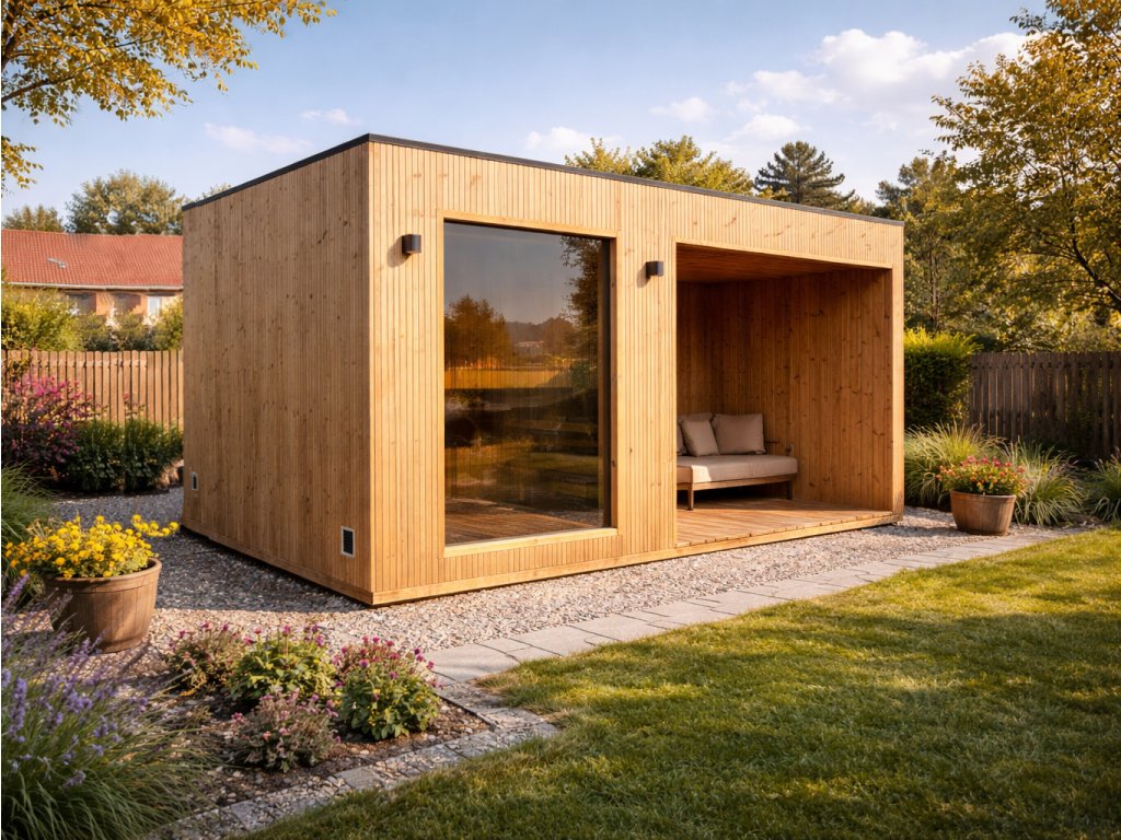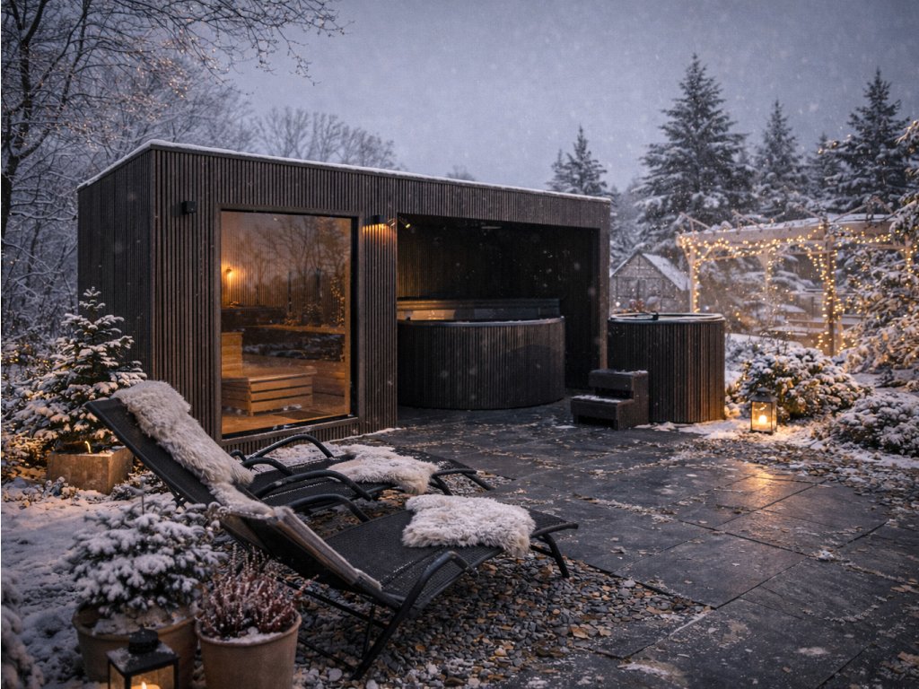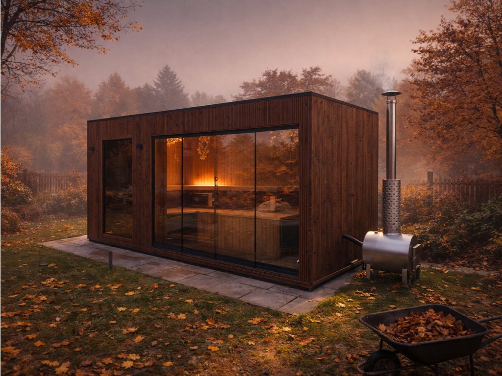 Sauna samotná zůstává kompaktní a efektivně vyhřívaná. Terasa rozšiřuje možnosti využití bez nutnosti další stavby.