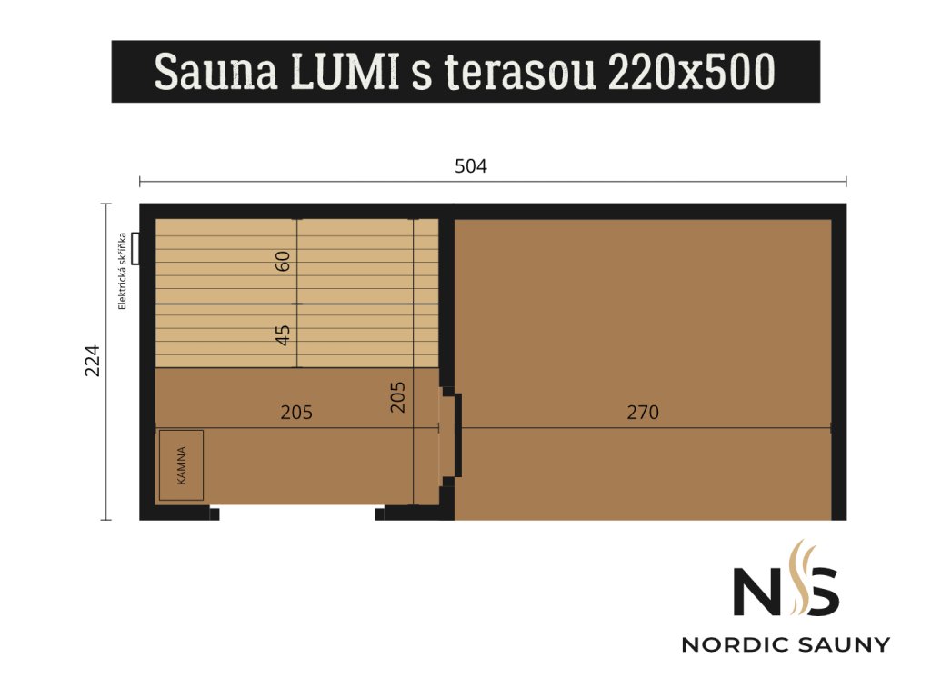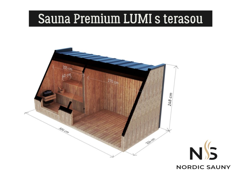 Nordic Sauny LUMI s terasou je kombinace sauny a kryté terasy v jednom celku o rozměru 224 × 504 cm. Nabízí plnohodnotnou saunovou místnost, kvalitní thermo dřevo, silnou izolaci a rozšířený prostor pro odpočinek.